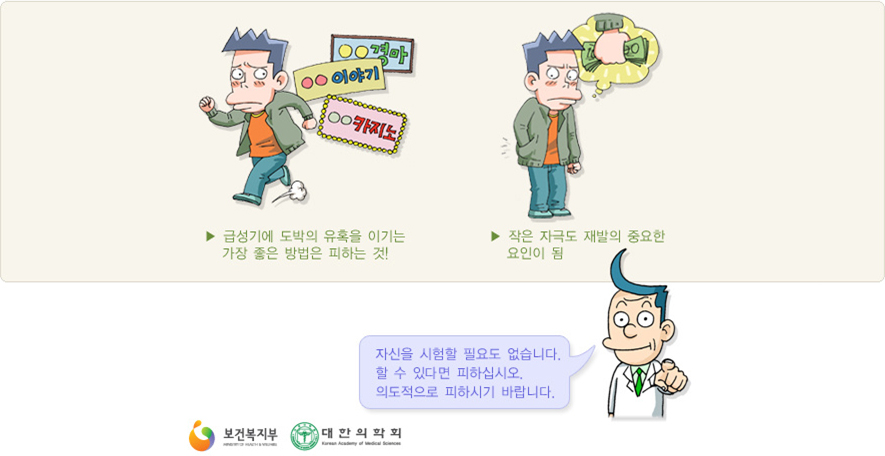 - 급성기에 도박의 유혹을 이기는 가장 좋은 방법은 피하는 것입니다. 바로 36계 전법입니다. 어떤 강력한 의지도 지속적 자극 앞에서는 무력할 뿐입니다. 자신을 시험할 필요도 없습니다. 작은 자극도 재발의 중요한 요인이 됩니다. 할 수 있다면 피하십시오. 의도적으로 피하시기 바랍니다. 주머니에 돈이 있다면 당신은 이미 진 것이나 다름없다는 사실을 명심해야 합니다. 유혹의 전화가 오는 경우도 마찬가지입니다. 계속 전화를 받고 있다면 입으로는 안 간다고 거절하고 있을지라도 이미 욕구 앞에 무너질 준비를 하고 있는 셈입니다.
